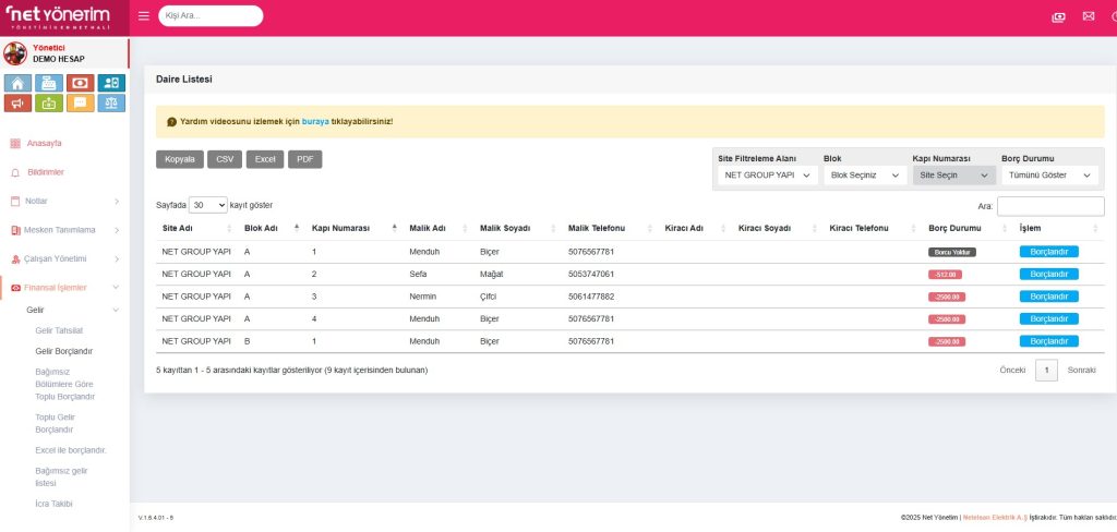 Bu kılavuz, Net yönetim yazılımı üzerinden dairelere özel olarak nasıl yeni borç kaydı oluşturulacağını adım adım açıklamaktadır.