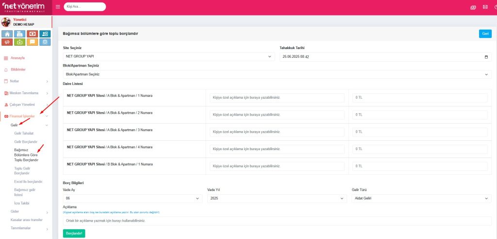 Bu kılavuz, Net yönetim yazılımı üzerinden birden fazla bağımsız bölüme (daireye) tek seferde, farklı tutarlarda nasıl borç ekleneceğini açıklamaktadır. Bu özellik, özellikle her daire için değişkenlik gösteren ısınma, elektrik veya su gibi giderlerin dağıtımı için büyük kolaylık sağlar.