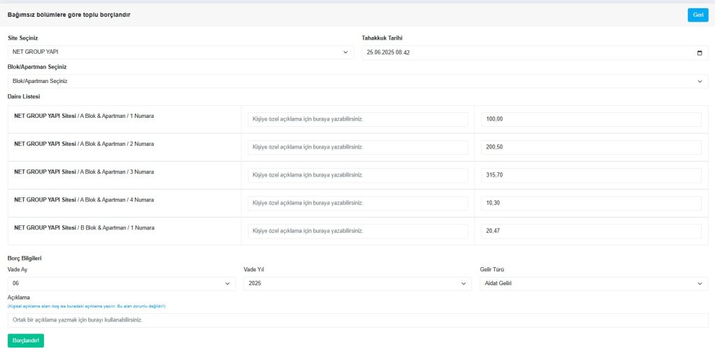 - Kişiye Özel Açıklama: Her bir borç kalemi için daireye özel bir açıklama ekleyebilirsiniz.