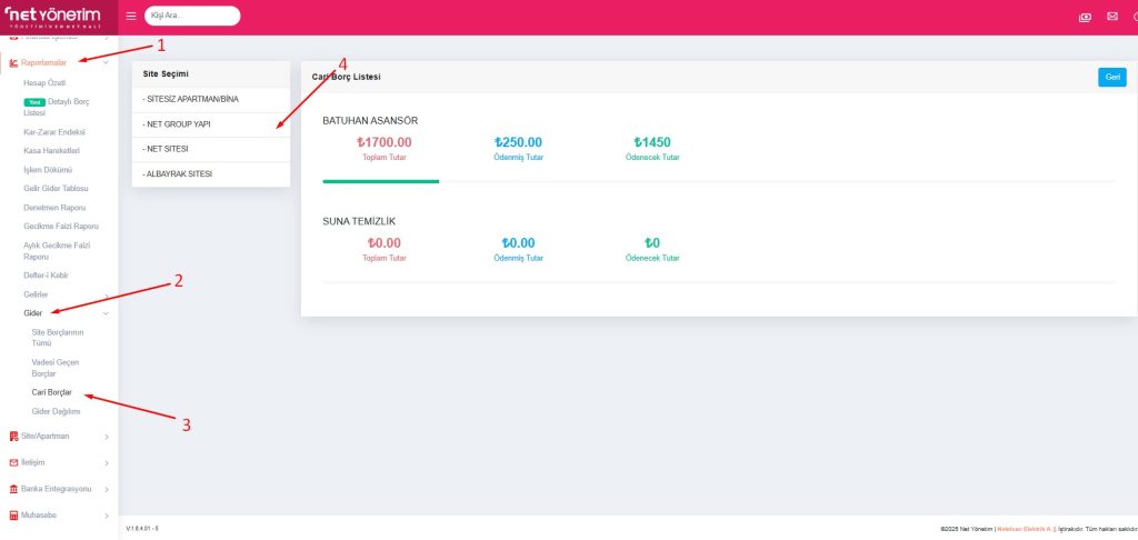 Bu kılavuz, Net Yönetim yazılımı üzerinden, sitenin tedarikçilere (carilere) olan borç durumunu özetleyen “Cari Borçlar” raporunun nasıl kullanılacağını açıklamaktadır. Bu rapor, her bir hizmet sağlayıcıya ne kadar borç olduğunu, ne kadarının ödendiğini ve ne kadar bakiye kaldığını toplu olarak gösterir.