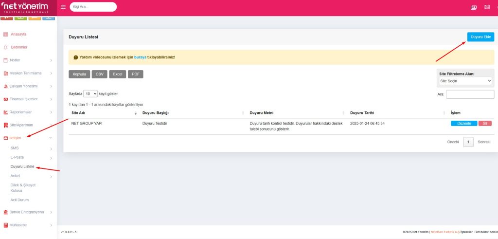 Net Yönetim – Duyuru Yönetimi Kılavuzu