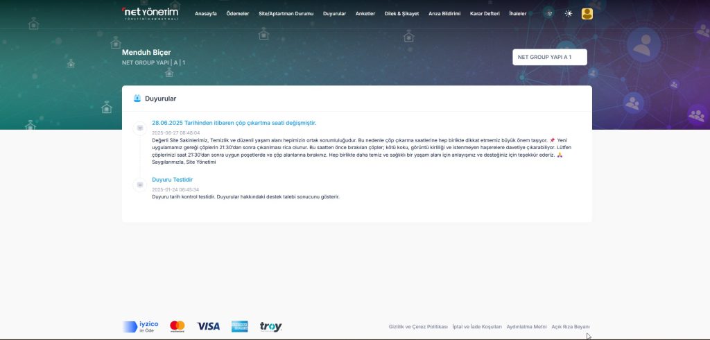 [duyurulistesi.jpg]) görebilirsiniz. Her duyurunun satırında bulunan Düzenle butonu ile içeriğini güncelleyebilir veya Sil butonu ile kalıcı olarak silebilirsiniz. - Sakinlerin Görüntülemesi: Yayınladığınız duyurular, site sakinlerinin kendi web panellerinde (