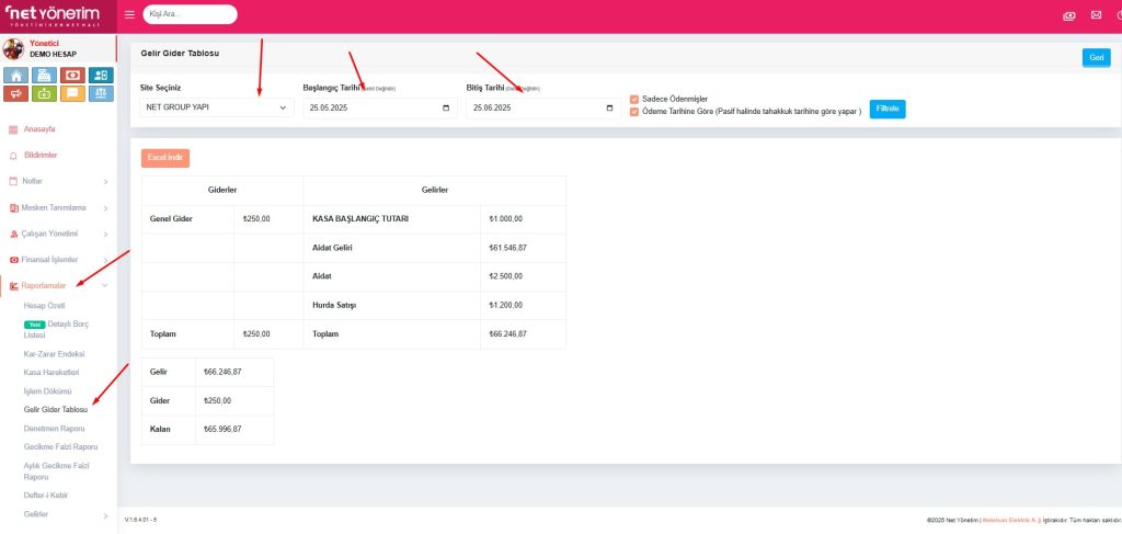 Net Yönetim – Gelir Gider Tablosu Raporu Kılavuzu