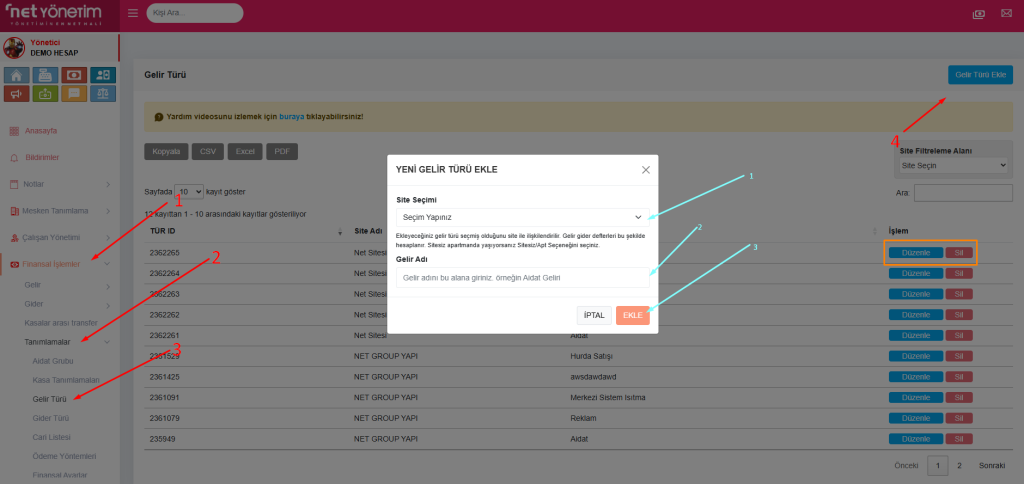 Site Seçimiyapılır. Gelir Adıalanına yeni kategorinin adı yazılır (Örn: “Reklam Panosu Geliri”, “Ortak Alan Kullanım Bedeli”).- “EKLE” butonuna basılarak yeni gelir türü kaydedilir.