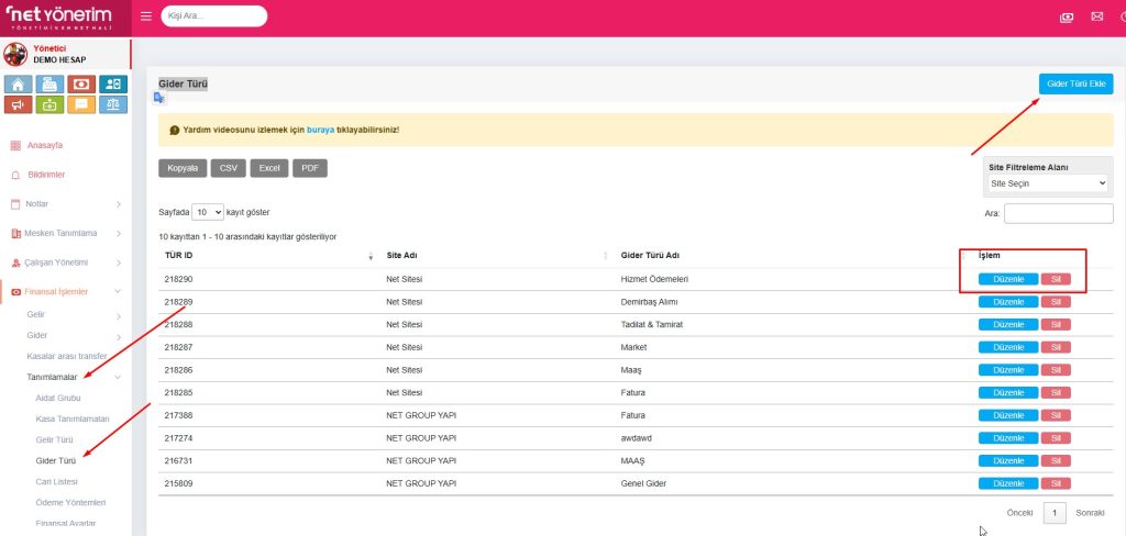 Net Yönetim – Gider Türü Yönetimi Dokümantasyonu