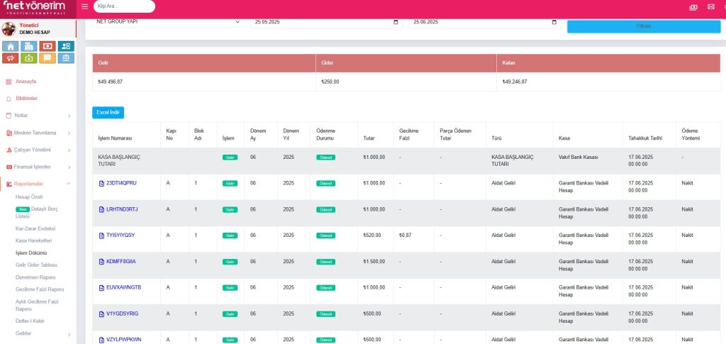 Bu kılavuz, Net Yönetim yazılımı içerisinde gerçekleştirilen tüm finansal işlemlerin (gelir, gider, tahsilat vb.) tek bir liste halinde dökümünü sunan “İşlem Dökümü” raporunun nasıl kullanılacağını açıklamaktadır. Bu rapor, belirli bir dönemdeki tüm mali hareketleri detaylı olarak incelemek ve denetlemek için kullanılır.