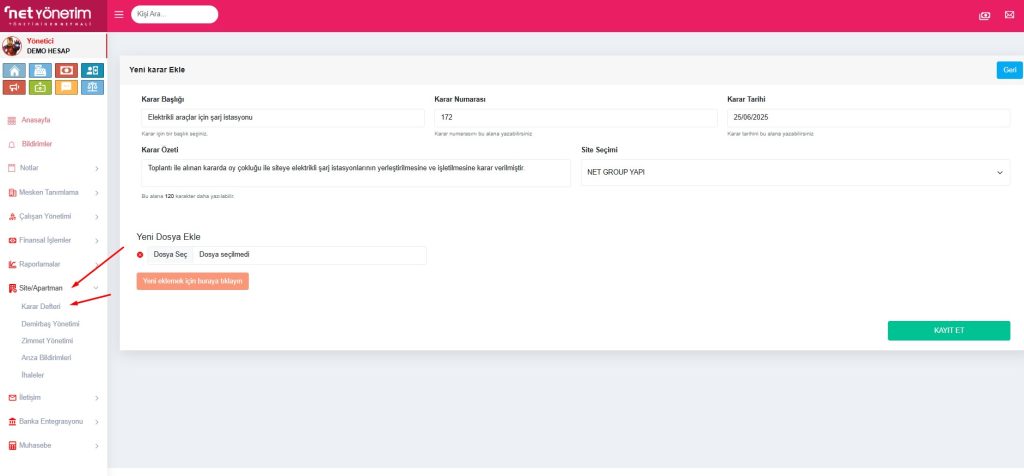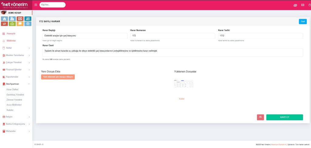 Bu kılavuz, Net Yönetim yazılımı üzerinden apartman ve site yönetim kurulu tarafından alınan kararların nasıl kaydedileceğini, yönetileceğini ve takip edileceğini açıklamaktadır.