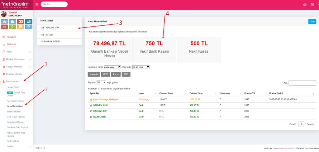 Bu kılavuz, Net Yönetim yazılımı üzerinden bir siteye ait kasaların (banka hesapları, nakit kasası vb.) detaylı işlem dökümlerini listeleyen “Kasa Hareketleri” raporunun nasıl kullanılacağını açıklamaktadır. Bu rapor, belirli bir kasanın seçilen tarihler arasındaki tüm para giriş ve çıkışlarını ayrıntılı olarak incelemenizi sağlar.