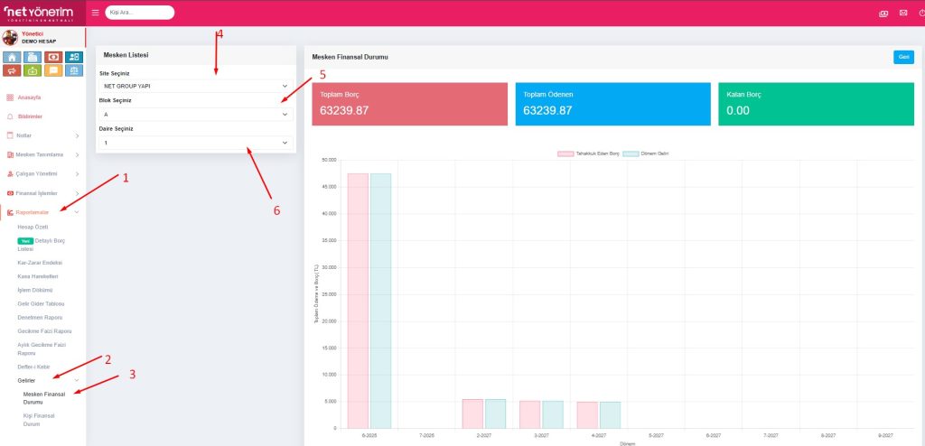 Bu kılavuz, Net Yönetim yazılımı üzerinden belirli bir meskenin (dairenin) genel finansal durumunu, borç-ödeme özetini ve aylık gelir-gider grafiğini gösteren “Mesken Finansal Durumu” raporunun nasıl kullanılacağını açıklamaktadır.