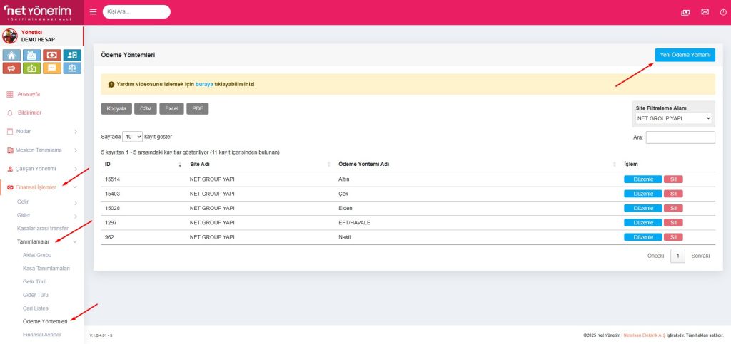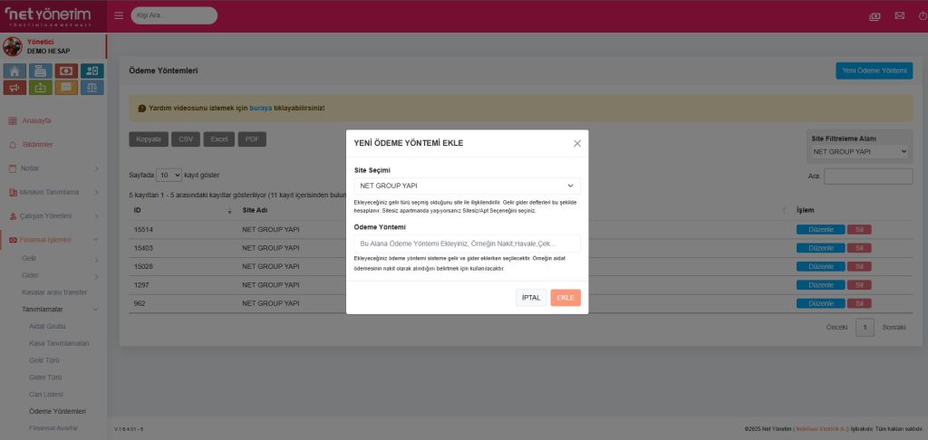 Ödeme Yöntemleri, bir site sakini veya kiracıdan alınan ücretin (aidat, kira vb.) hangi kanalla tahsil edildiğini sınıflandırmak ve takip etmek için kullanılır. Bu modül, finansal kayıtların doğruluğunu ve şeffaflığını sağlamada önemli bir rol oynar.