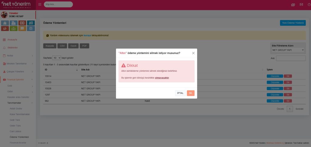 ⚠️ Dikkat: Geçmişte tahsilat işlemlerinde kullanılmış bir ödeme yöntemini silmek, eski kayıtlarda ve raporlarda tutarsızlıklara neden olabilir. Bu işlem geri alınamaz.