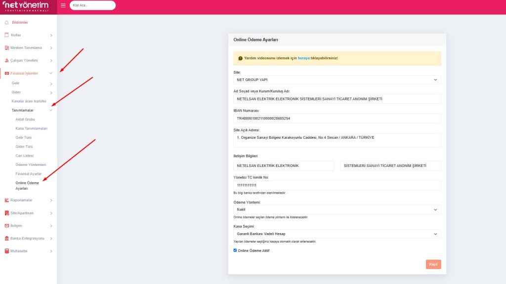 - Online Ödeme Aktif: Tüm bilgiler doldurulduktan sonra, online ödeme sistemini sakinlerin kullanımına açmak için bu kutucuğun işaretlenmesi gerekir.