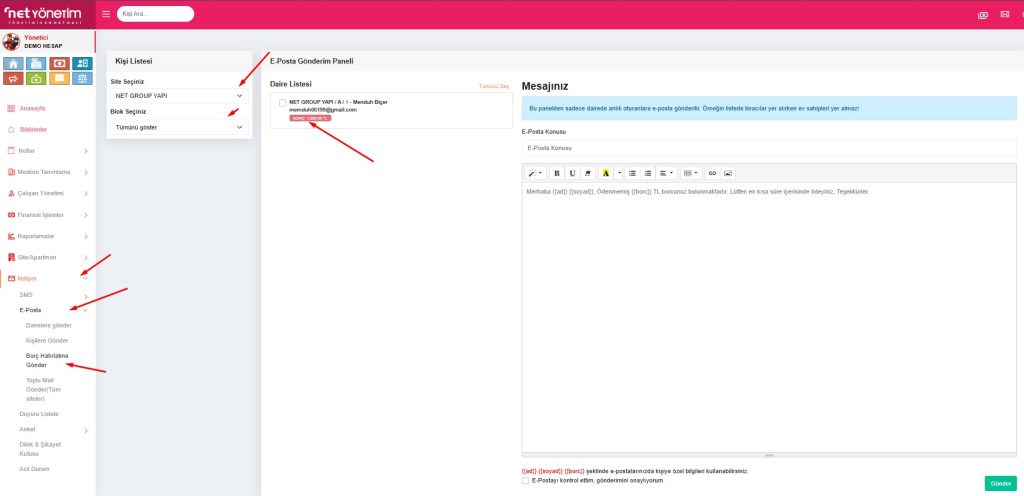 • Erişim: Sol menüden İletişim > E-Posta > Borç Hatırlatma Gönder yolunu izleyin.