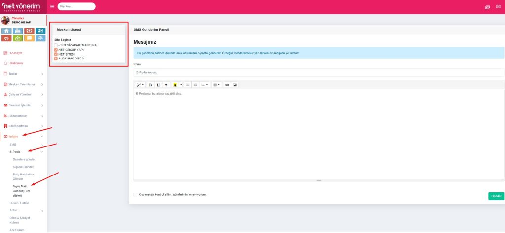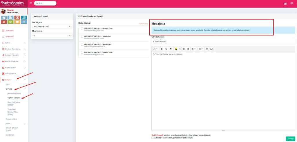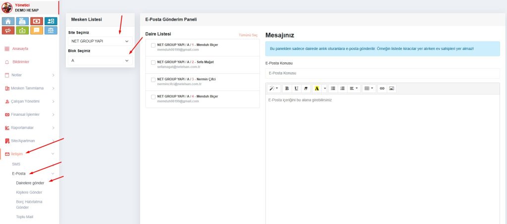 • Erişim: Sol menüden İletişim > E-Posta > Dairelere gönder yolunu izleyin.