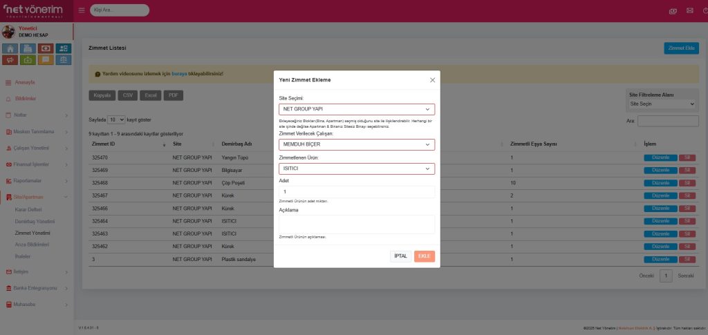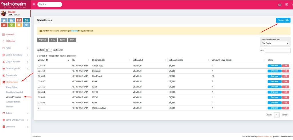 Bu kılavuz, Net Yönetim yazılımı üzerinden envanterdeki demirbaşların site personeline nasıl zimmetleneceğini, yönetileceğini ve takip edileceğini açıklamaktadır.
